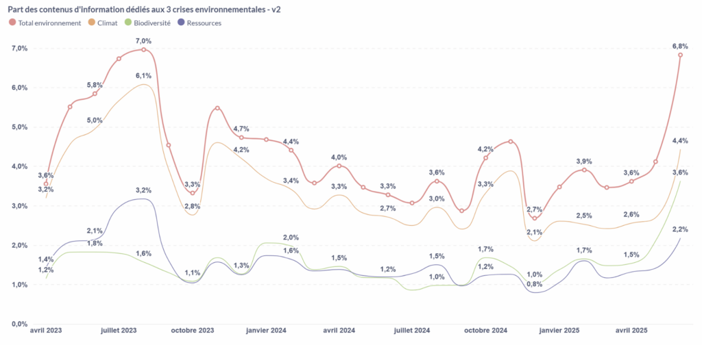 6,8% en juin 2025 de contenus d’information dédiés aux trois crises environnementales, en hausse de 83% par rapport à la moyenne annuelle de 2024 (3,7%).